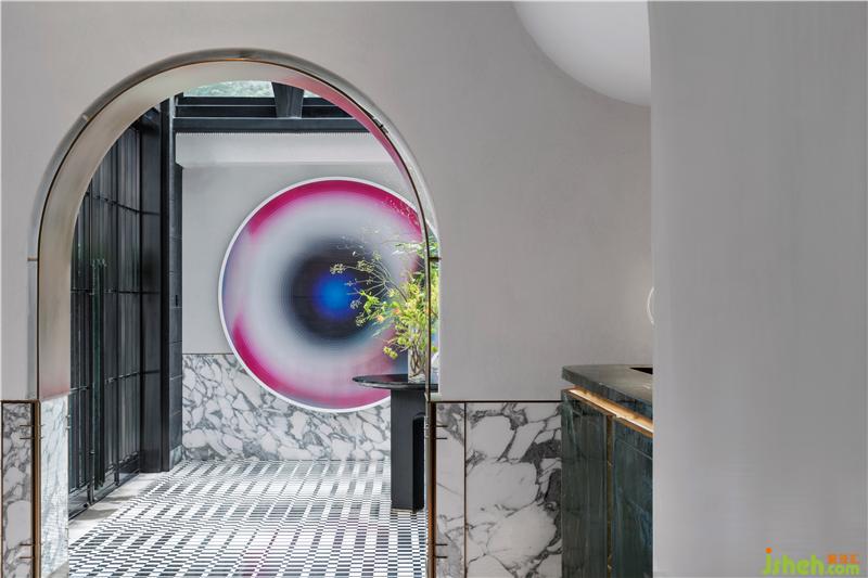 顏磊直指全球視野下的社會(huì)生態(tài),將宗教情結(jié)與現(xiàn)代主義、經(jīng)典與當(dāng)下進(jìn)行整合,通過抽象藝術(shù)手法進(jìn)行表現(xiàn),酒店設(shè)計(jì)創(chuàng)造彩輪這一視覺符號(hào),給人一種陷入時(shí)空隧道般的體驗(yàn)。