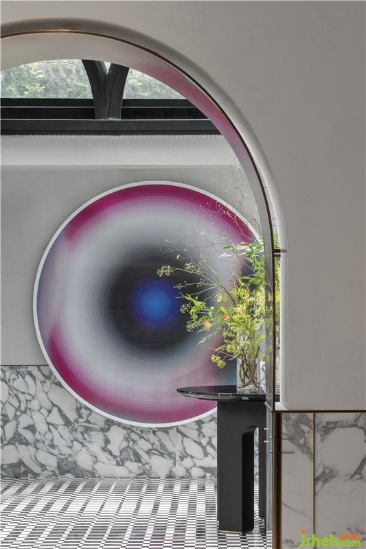 前廳懸掛著藝術(shù)家顏磊的作品《彩輪》,?彩和明暗關(guān)系中的遞進(jìn)與回旋,讓人泛起躍躍欲試的窺探欲,吸引著住客步入神秘的內(nèi)部空間。