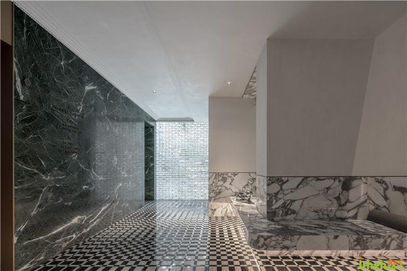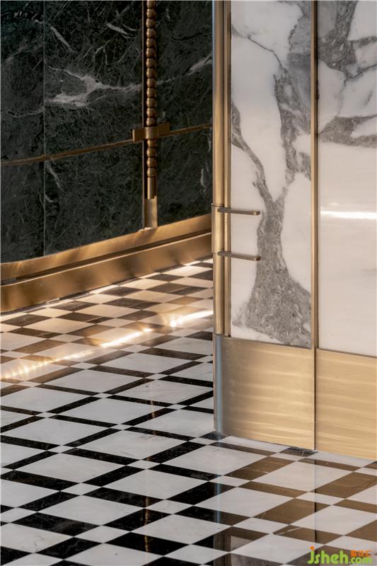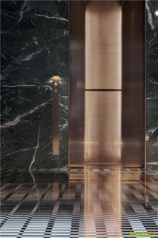 燈光映射在電梯門上,經(jīng)過地面的反射,巧妙地拓展了空間的向度。琥珀燈光與墨綠色的墻面和諧統(tǒng)一起來,別有一番絢麗風(fēng)情。