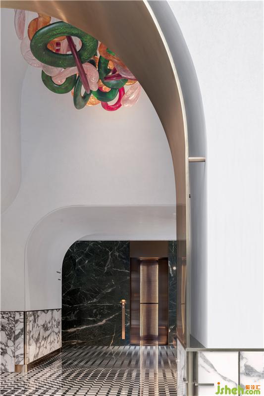 前廳由數(shù)條弧形曲線組成,將老上海的石庫門以抽象的形式描摹出來,以現(xiàn)代形式詮釋底蘊(yùn)豐厚的本土建筑符號(hào)。