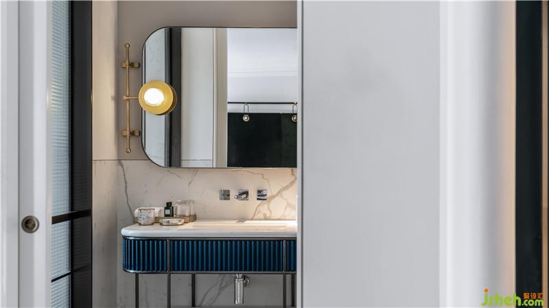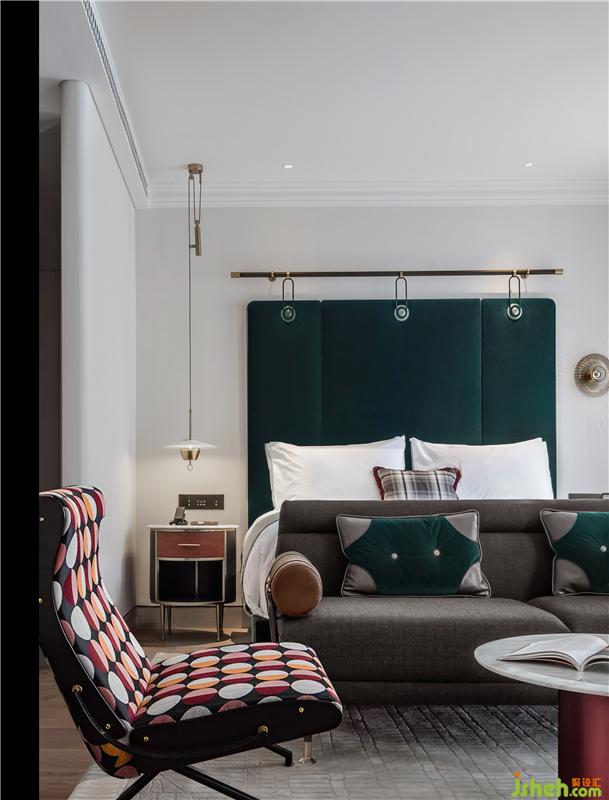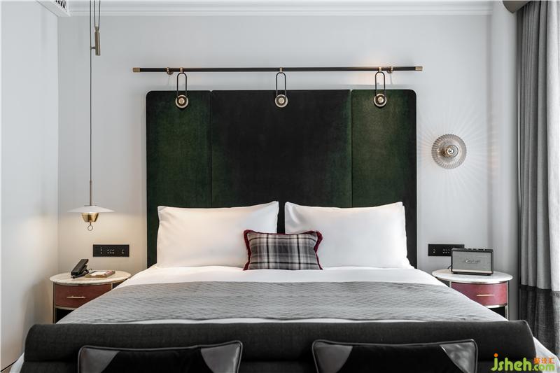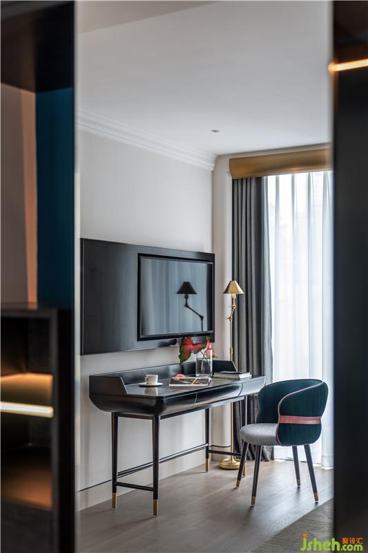 客房戶型規(guī)整通透,利落的線條與圓潤(rùn)的曲面相襯,勾勒出空間的層次感。這其中,雅致的淺白色系調(diào)和了墨綠與海軍藍(lán)硬朗的質(zhì)感。