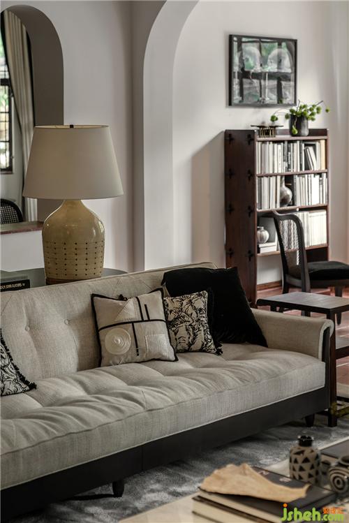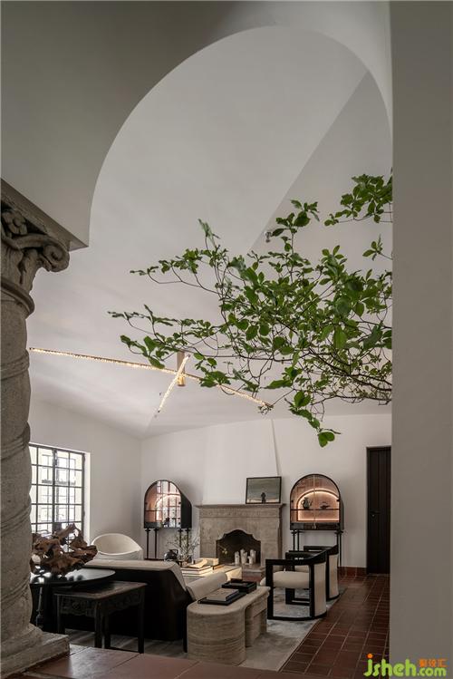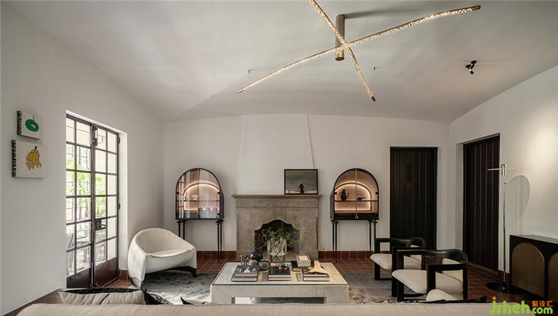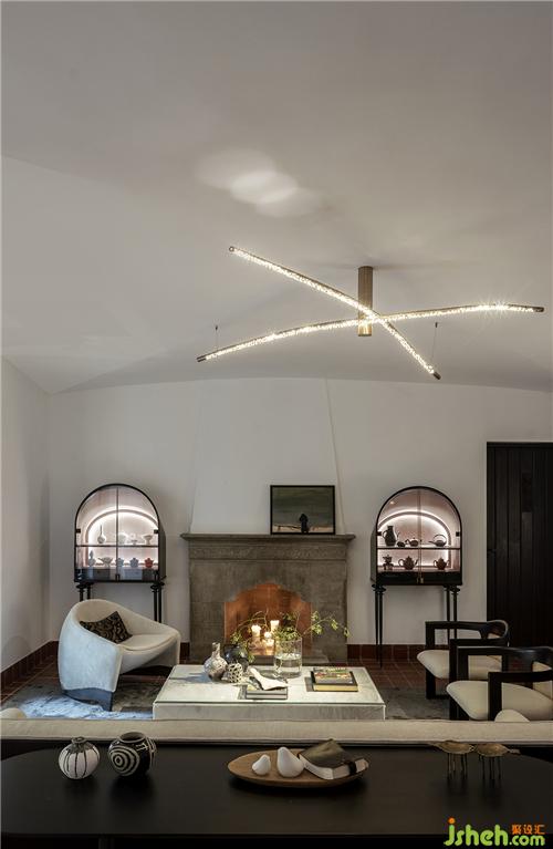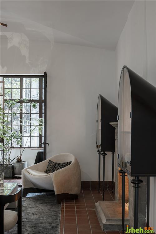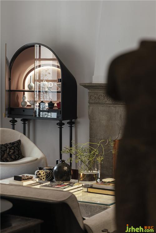 石材質壁爐、大理石茶幾、藝術擺件陳列,玩味藝術感官中,傳遞海派精致,糅合當代空間藝術的先鋒態(tài)度??臻g中的家具為設計師黃全原創(chuàng)設計,形神兼?zhèn)?,考究低調,注重形態(tài)美與舒適感。