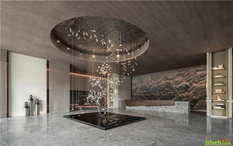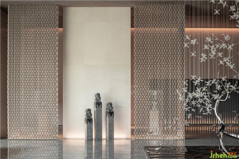 石獅陣肅穆、莊重,金屬現(xiàn)代感墻面以縱向線條依次排列,上海售樓處設(shè)計玩味出空間儀式感,讓人體味溫馨、細(xì)膩的空間情緒。
