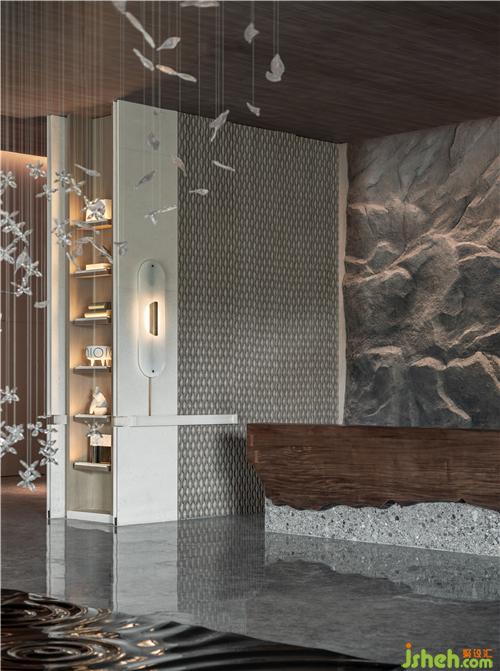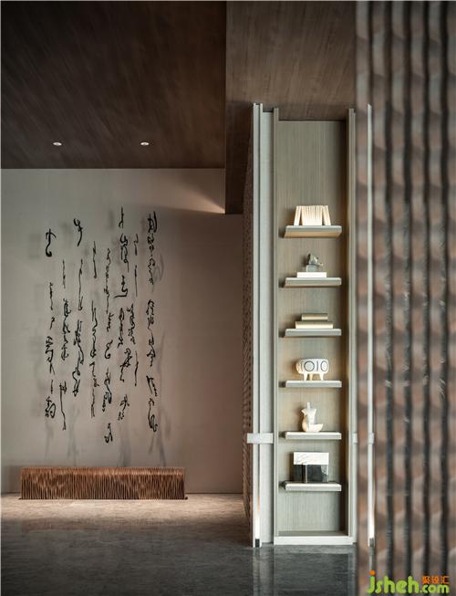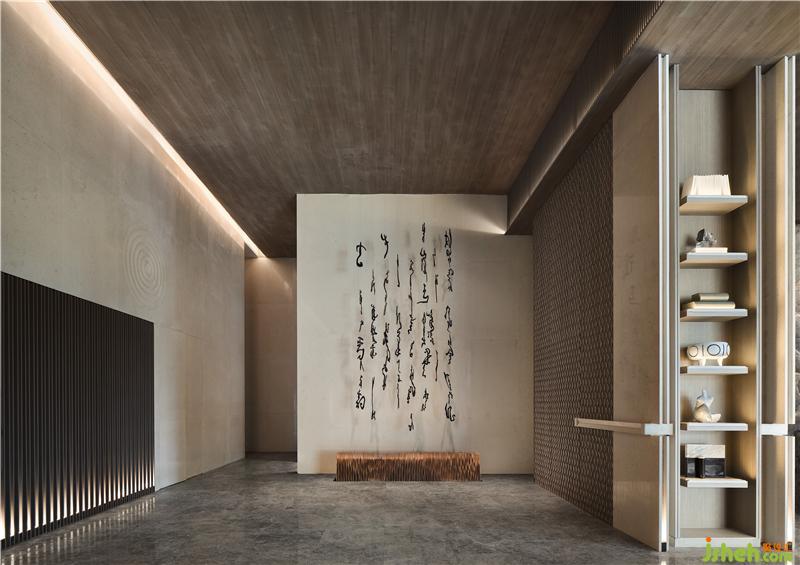 文字元素的「古」與現(xiàn)代技法的「今」相互碰撞交融,極簡空間因為幾行洋洋灑灑的大字更添魅力,大地色系彌漫貫穿于整體空間之中,如身臨山石真境,使人感受舒適、安寧。