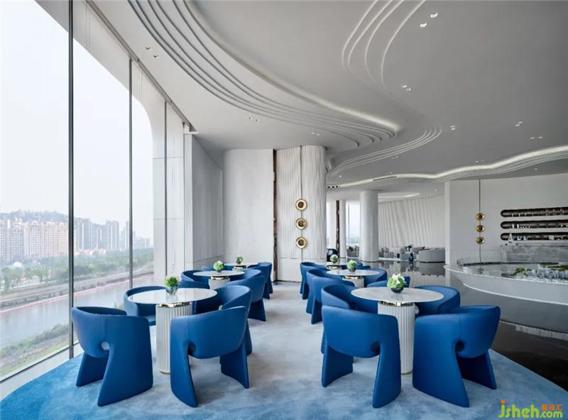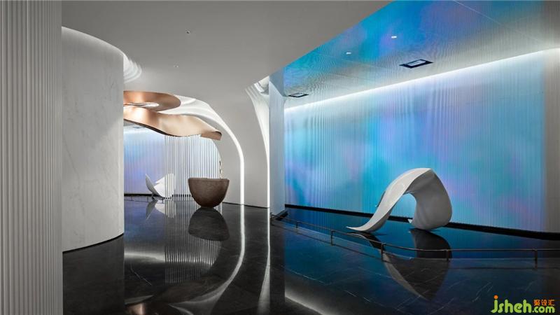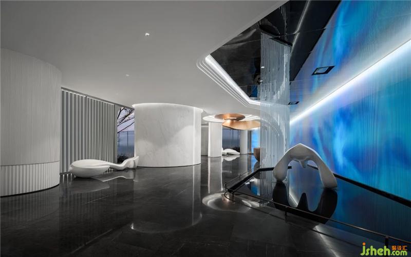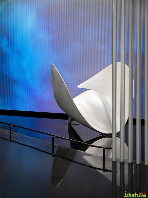 藝術(shù)家說,大海的藍(lán)有50種色度。豐富的色度流動于空間墻面,如絢爛之花,與水景相映成趣。基于動態(tài)墻面海景進行延伸,抽象藝術(shù)形態(tài)裝置如翻卷的浪花,委婉道出來自深海的寧靜獨白廣州營銷中心設(shè)計。