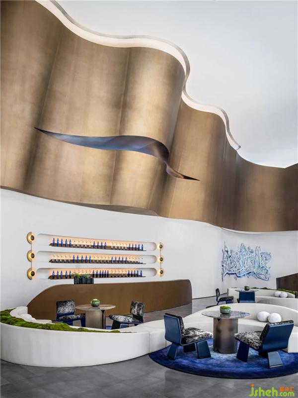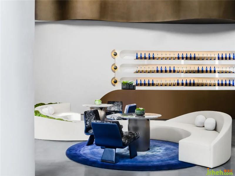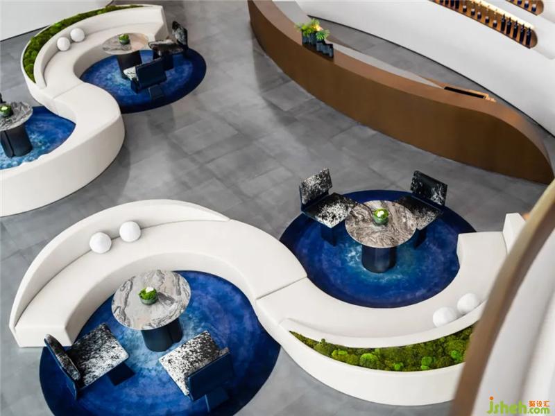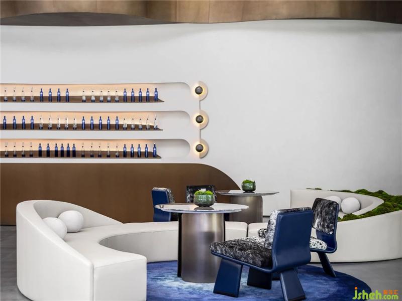 星月之藍(lán)在空間中反復(fù)運(yùn)用,在洽談水吧區(qū)落成一方藝術(shù)圓毯,以及整齊陳列的貯酒區(qū)。設(shè)計師意圖通過藍(lán)呈現(xiàn)為一種意識,如星空一般純粹、靜謐,與白的純凈柔軟映照,安放浮躁、喧囂之心。