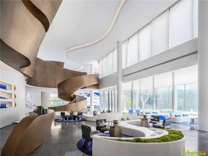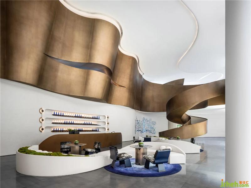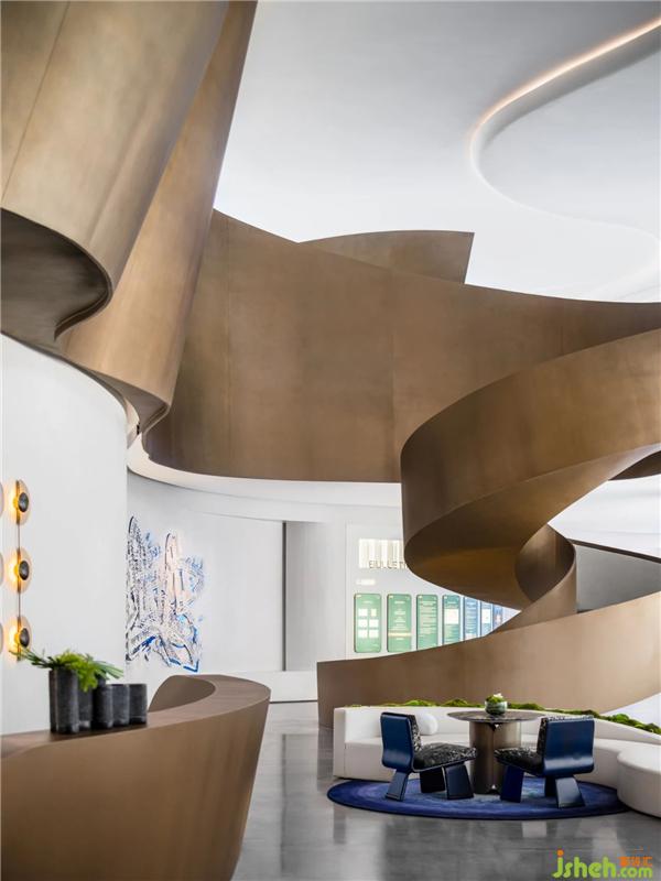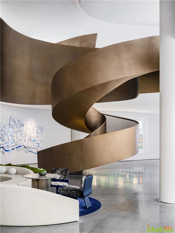 承天梯之勢,望云卷云舒。自地平面升起的旋轉(zhuǎn)樓梯躍升、變化,將空間的視覺旋律曼妙舒展??臻g形態(tài)翻卷成浪,仿佛被賦予神奇魔力,給人以被環(huán)抱的柔軟。