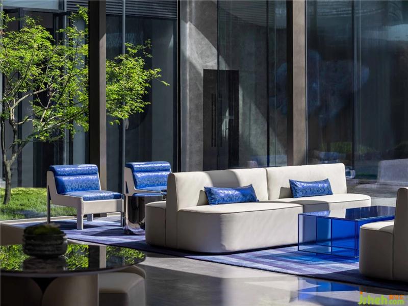 空間采光與室外景觀的融合也被充分考慮,設(shè)計師大面積運用落地窗引景入室。綠植枝形婀娜,蔥蔥郁郁的顏色映照于空間中。深藍座椅曲線流利,微風(fēng)襲襲中,自然相映的都市風(fēng)味撲面而來。