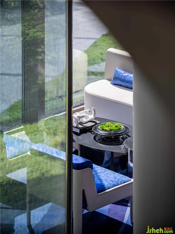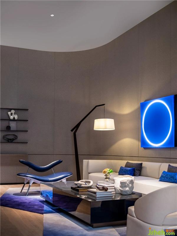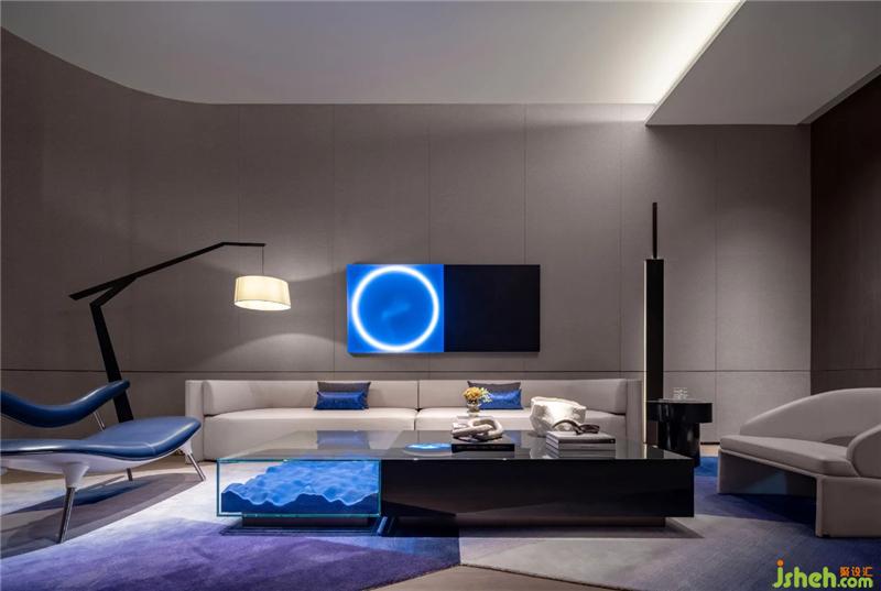 VIP室整體呈現(xiàn)未來感,設(shè)計師以一抹灰度為空間定調(diào),極簡空間強調(diào)現(xiàn)代、科技感。藍色中一抹圓的藝術(shù)裝置成為視覺中心,像一個時間蟲洞,引人順著光的指引,在時空的隧道中旅行。