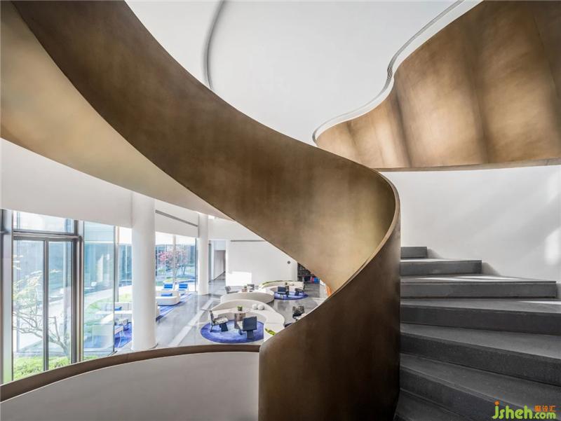 在曲面的夢幻空間中游走,盤旋而上的旋轉(zhuǎn)樓梯營造出一份驚喜感。你既能在其中體會由光呈現(xiàn)的空間隱喻,又能感受到景觀穿行于其中的微妙樂趣。在墻面設(shè)計中,除了極簡的純白與圣光相映,設(shè)計師仍保留了區(qū)域代表性元素,使其突出功用性中信息的傳遞。