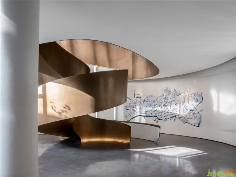 在曲線構(gòu)筑的空間中,陽光猶如在墻面攀爬,與空間柔和交織,形成深淺不一的灰,與旋轉(zhuǎn)樓梯形成油畫般的高級色搭配。
