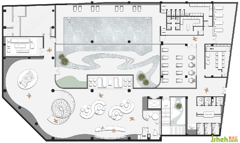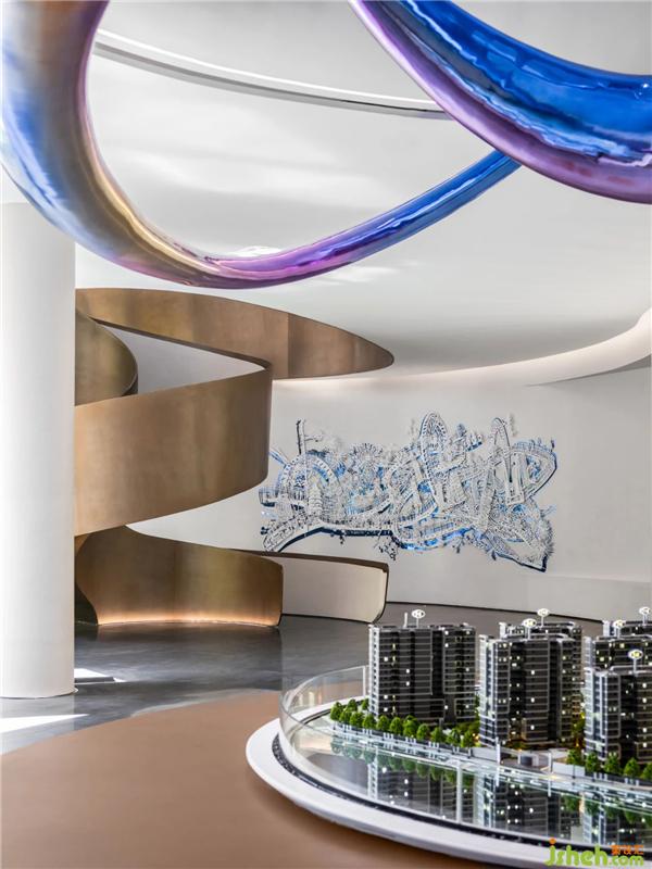 沙盤區(qū)的整體構(gòu)造完美承接空間形態(tài),形成一個自洽的環(huán)形區(qū)域,使觀覽動線更為流暢,游覽視角更為隨心。曲面使空間柔化而充滿形態(tài)的隱喻,為觀覽者帶來更多的空間想象杭州售樓處設(shè)計。