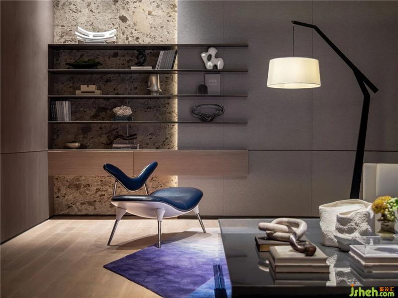 墻面擱架以細線條呈現(xiàn),上面擺放著書籍、藝術(shù)裝飾。強調(diào)造型工藝的臺燈立于一角,烘托著空間的氛圍。沉浸于靜謐的流動時光,簡單的閱讀空間亦可成為歇心之地。
