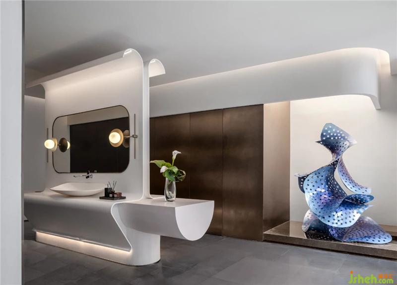 衛(wèi)生間藝術(shù)裝置呈現(xiàn)為水浪流動的形態(tài),仿佛錢塘江的潮水,流露出競奔不息、永立潮頭之勢,構(gòu)筑出地域文化的精髓和靈魂。臺盆設(shè)計延續(xù)空間的「水」元素,鏡立面頂部猶如延伸出一朵浪花杭州售樓處設(shè)計,為空間帶來生趣。