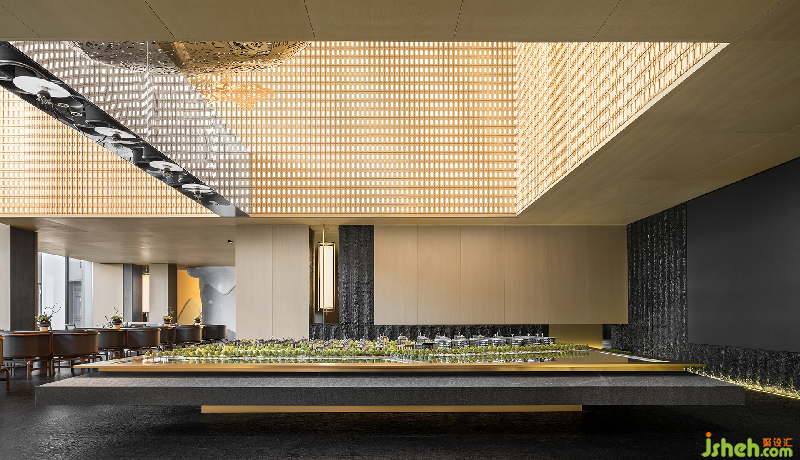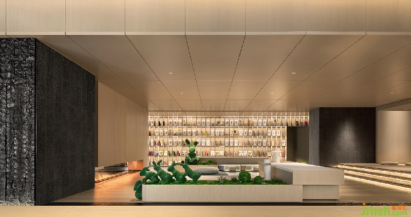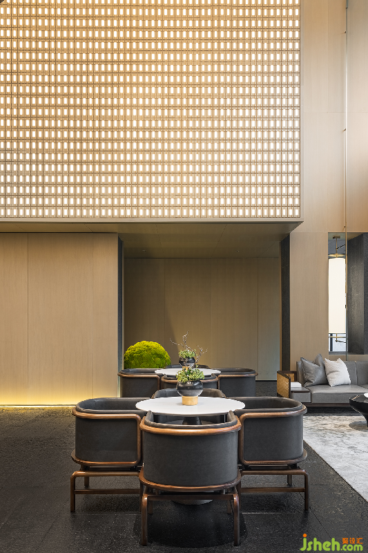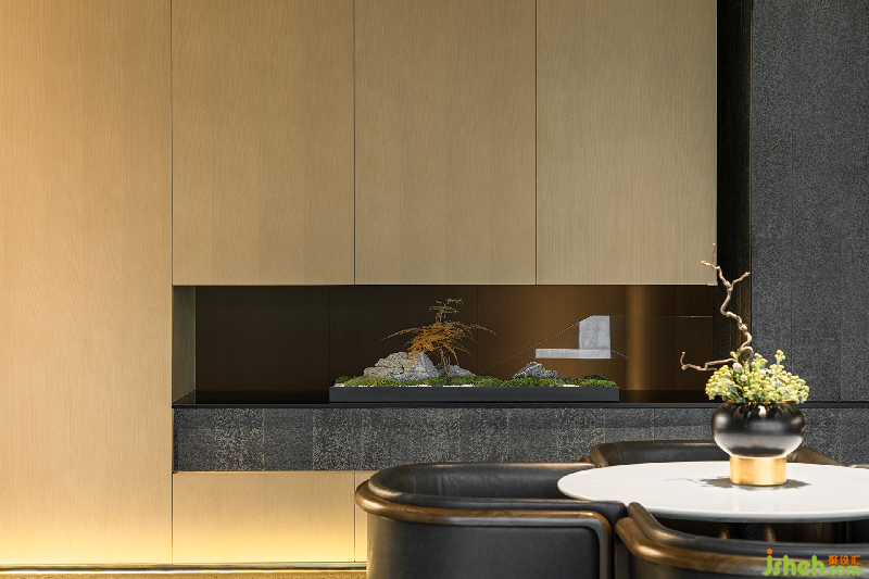 前廳以巧妙的分割剝離出一個線條與層次分明的包容性空間。石面粗糙質地帶來的是與自然的原始風味深刻銜接之感,綠植元素融入其中體現(xiàn)為東方設計特有的禪意。