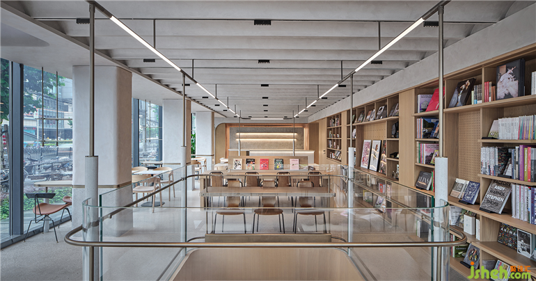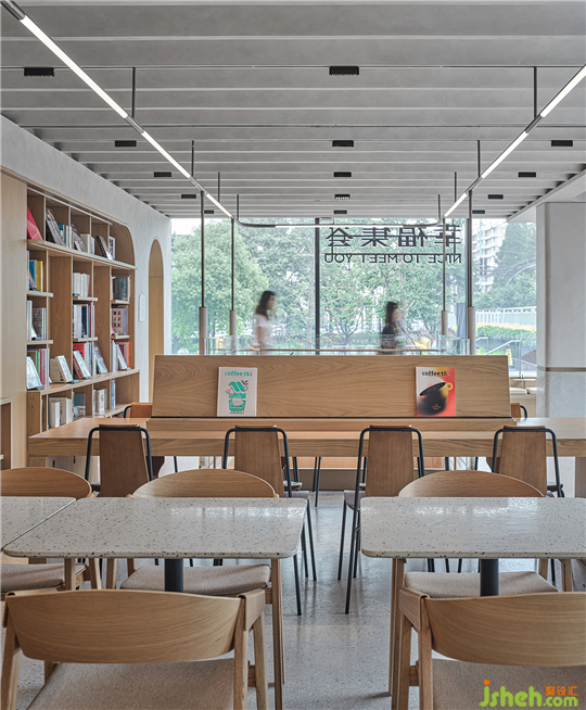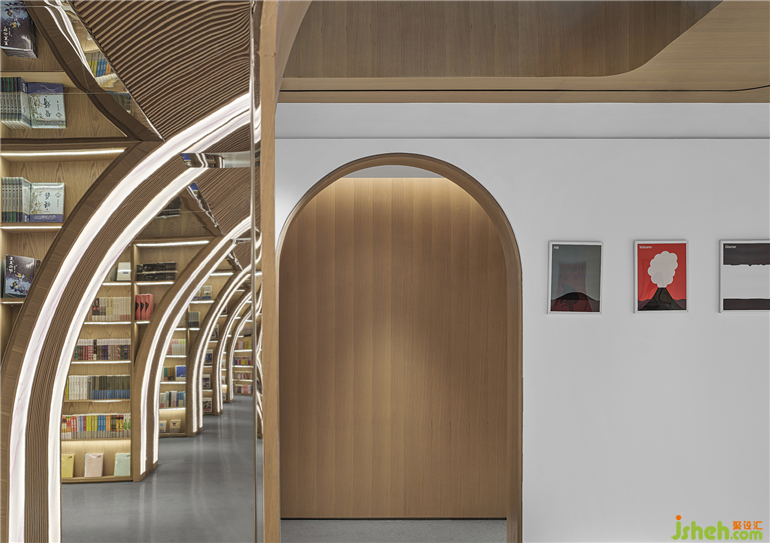 自然光散落墻體,使一抹純白映照出空間的詩意。書店設(shè)計原木材質(zhì)的巧妙覆蓋如同自然生長于墻體,自然與建筑空間無縫銜接,顯露時間釀就下樹木原生材質(zhì)的自然光澤與質(zhì)感,帶來的是城市生活方式對自然的崇敬與回歸。