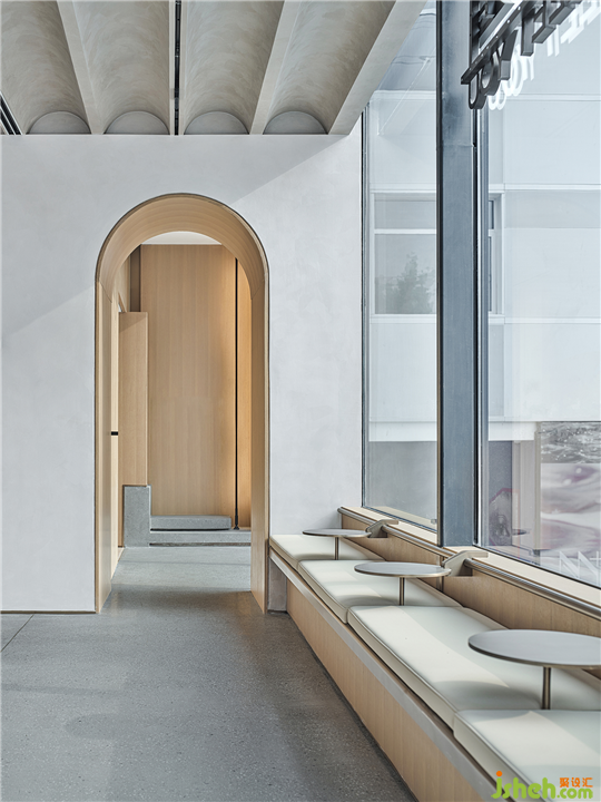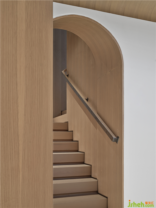 一層區(qū)域的視覺重點被設(shè)定在水吧區(qū)。開放式吧臺便于迎接訪客,水平線加強視覺的延伸感,敞開、開放的姿態(tài)帶來整體空間氣質(zhì)的平和。