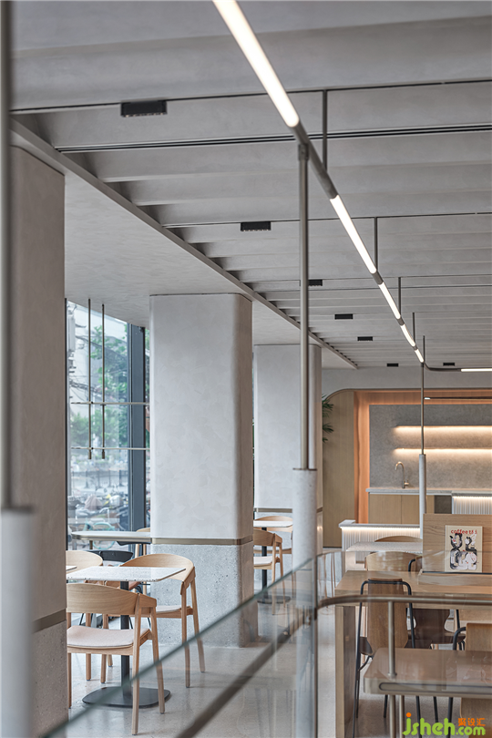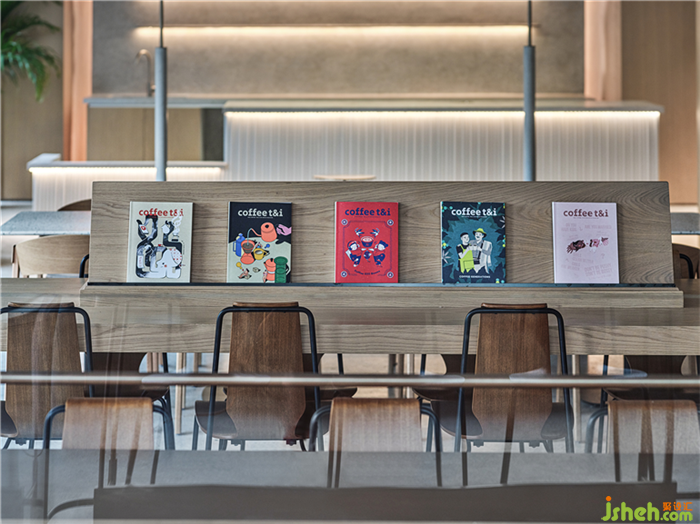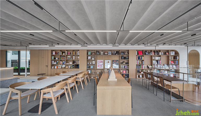 咖啡廳長桌縮減了陌生人之間的距離,加強自由的社交氛圍感。曲面天花如同跳躍的浪花,強化空間體量,秩序分明,動線清晰。