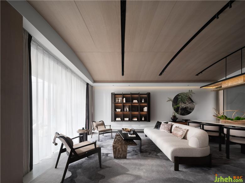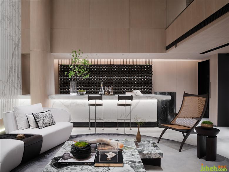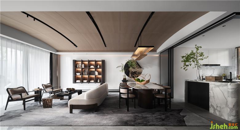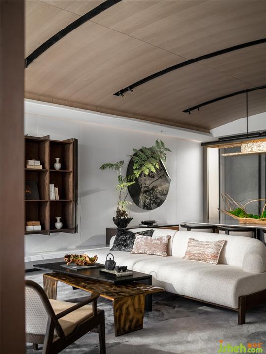 大氣、簡明的空間具備充分的文化主體性,沒有冗雜的視覺焦點,使極簡美學在空間做到減法的極致。猶如古代畫匠的筆墨,功力深厚,不多著色,不少疏漏,一氣呵成。以沙發(fā)視角來看,功能性在第一印象被削弱,與天花的曲線映照流露充分的現(xiàn)代美學光澤,氣宇軒昂,璀璨動人。