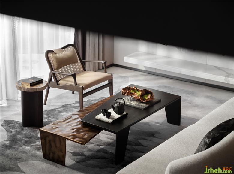 文人以茶會友,品茶論道。茶,作為一種美學介質,安撫著內心的波瀾,介入生活,沁潤心緒。手撫微溫杯盞,徐徐對談,升格的溫度與空間材質輕微發(fā)酵。設計師使經典的木材成為椅座基底,咖色光澤中折射光線下的雅綠,舒朗的廓形中式而富意境,椅背是疏密有度的織物,手扶石面小茶幾,手捧厚頁讀物,流露古典美感生活在當下的特質。