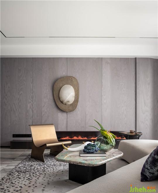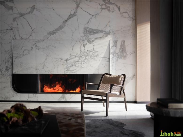 光的篩入錯落有致,得益于層層疊疊的山巒,自然的形態(tài)被抽象運用于空間中,形成豐富的層次光。光,賦予空間更明朗的形態(tài),折射于大理石覆蓋的墻面,使壁爐生輝。疊墅樣板間設計中式意境以一把舒朗姿態(tài)的座椅而拔勢,傲然挺立,卻又是處世不緊不慢的翩翩君子。