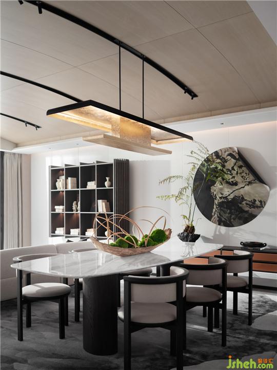 圓形藝術畫是餐食空間的視覺中心,擁有精微細致的形態(tài)處理,化靜為動,增添觀賞的意趣。抽象的畫面表現(xiàn),靈感源自水墨畫,現(xiàn)代的筆觸在內容呈現(xiàn)中富余雅趣與空靈。大理石臺面與曲面畫協(xié)同一致,輕薄飄逸,漂浮于厚重桌腳。座椅廓形筆墨公正,弧度與正直剛柔并濟,宛若書法的蒼勁與力道。