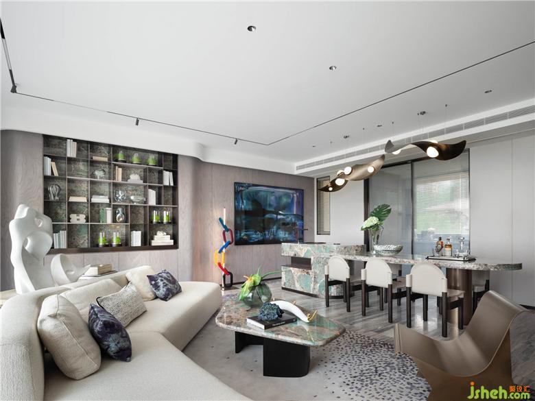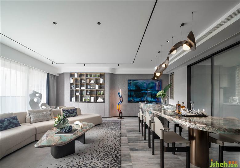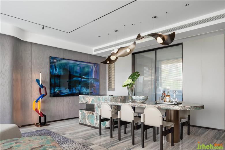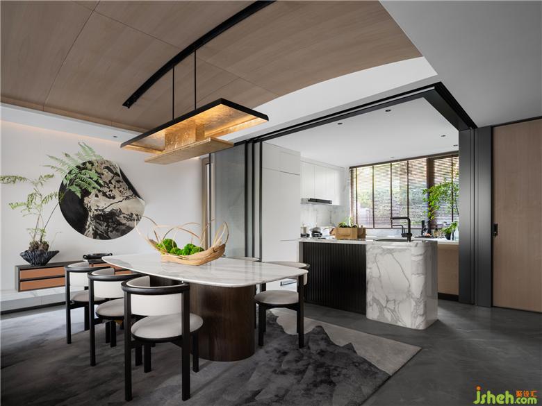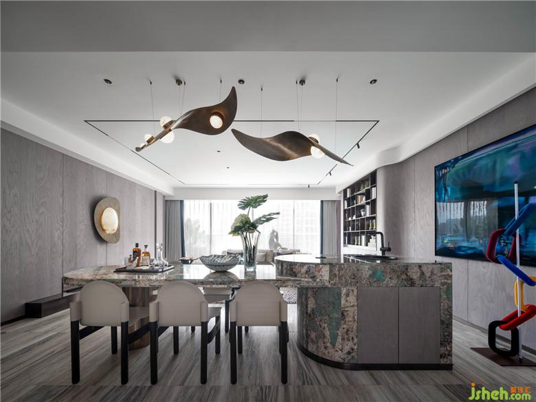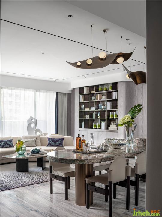 餐食空間擁有豐富的材質色彩。大理石材質擁有色彩活潑的紋路,猶如水面游動的湖面,透過水光,浮現(xiàn)水草的旖旎之態(tài)。設計師運用金屬材質使座椅擁有更為鮮明的廓形,巧妙的弧面處理,流露輕奢生活的摩登意趣。