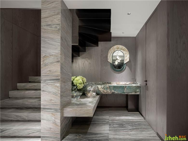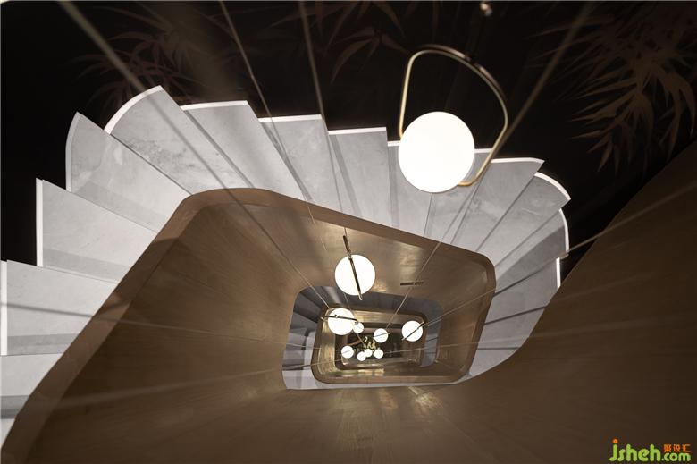 通往地下室的旋轉樓梯擁有緊密卷曲的形態(tài),曲線中有犀利的彎折,疊墅樣板間設計造型感使其圍繞圓心擁有遞進層次。層層剝離,由古雅的植被形態(tài)到,流于一體的水磨石,到金屬材質,視點最終聚焦于下墜的燈具,形成一種自然散落的美。
