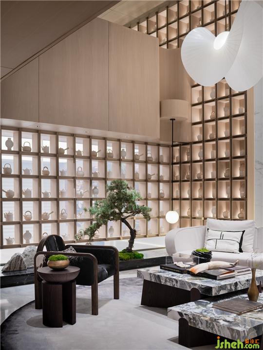 墻面木材質賦予空間自然質感,材質間的細密線條與天花形成天然呼應。藝術裝置「島閣」如靈眸聚焦于墻面。湖中島,呈現(xiàn)了人類窺視自然的另一個維度,如大地藝術般呈現(xiàn)空間的靈動生機。在現(xiàn)代的空間中,人們也有充分的空間回歸自然。