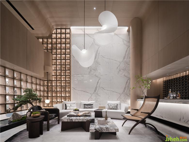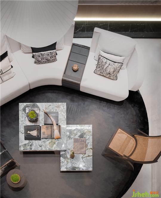 垂直墜落的兩片羽毛以夸張的手法賦予燈光別致的形體。羽毛輕輕飄落,在空中翻轉,瞬間之美被截取定格。會客空間以彎折的沙發(fā)椅圍合,大理石紋路暈染顏色,聚合一片雅仕生活的從容感之態(tài)。