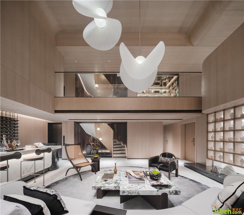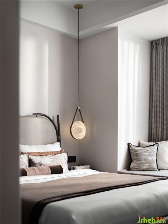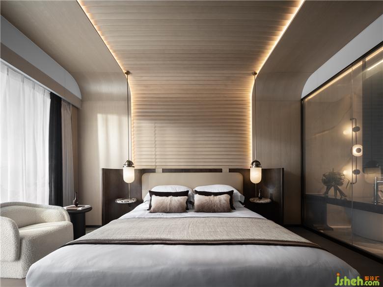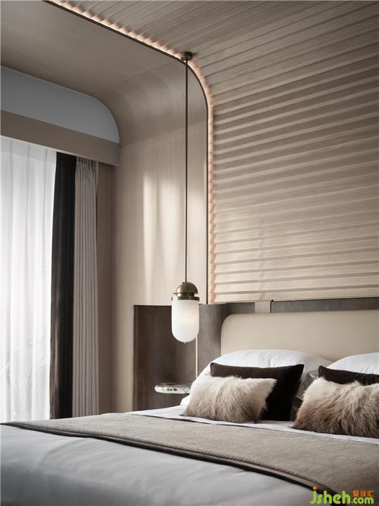 鮮明的符號元素為空間增色。針對主臥室盥洗空間,設計師將翻啟的書卷形態(tài)倒映于天花,墻紙紋路寥寥幾筆,疊墅樣板間設計方與圓搭配原木材質配比切割于洗手臺,奠定空間儒雅氛圍。雙臺盆的處理通過中式復古的形式,極大創(chuàng)新當下人日常生活情境。公子攜帶的玉佩有“翩翩君子,溫潤如玉”的美意,設計師將其抽象運用于緊貼墻面的燈具,使得空間的符號與形式感強化,凸顯藝術融于生活的意味。