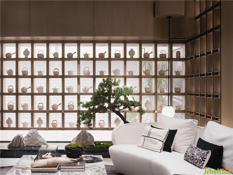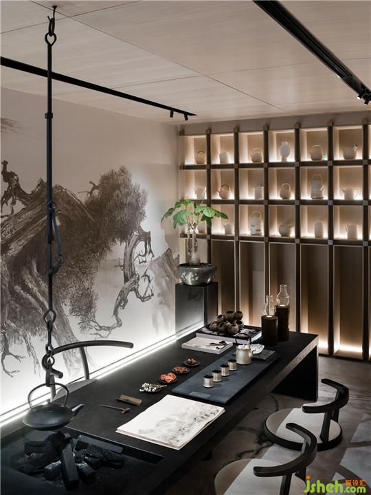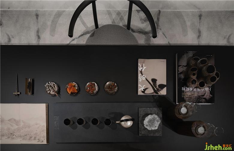 高濃度的器物展陳成為空間表達美的一種方式。飄香的茶閣以長桌舒展,輔以茶具、陶器,金屬器皿。椅座擁有包裹的張力,分布對座儀式為空間聚氣,呈現(xiàn)不拘一格的雅仕生活態(tài)度。