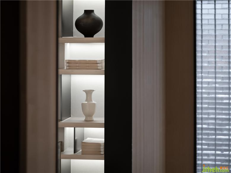 頂天立地的擱架極大豐富空間層次,細密方格具備收納功能,遠觀呈現(xiàn)細密網(wǎng)格星羅棋布。純粹的形體通過線條的劃分與細密分布擁有了層層遞進的序列。器物以美學展陳的方式呈現(xiàn),形成包裹于空間的藝術氛圍。