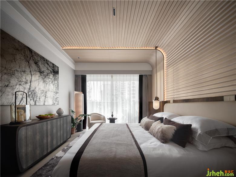 寢居空間擁有舒展的空間框架。單純的原木材質被處理為細密的幾何切割,覆蓋于側面與頂面。這樣的細膩巧思亦被體現(xiàn)在線條處理中,使功能的層次分明,裝飾性元素成為空間的亮點。