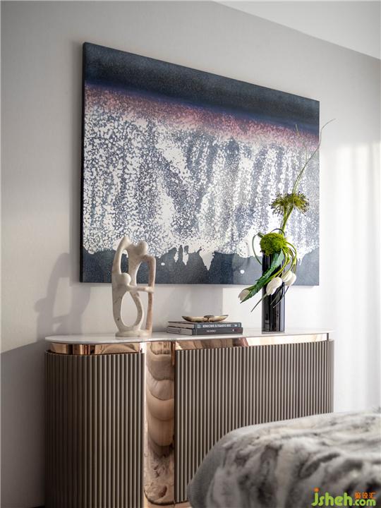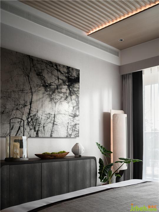 整體空間基調在中性中,強調細膩、纖柔。藝術作品的優(yōu)雅呈現(xiàn)與現(xiàn)代感的空間格調交織。簡明的線條經過極為細膩的處理,翩然漂浮天花,如水彩畫的細著筆。