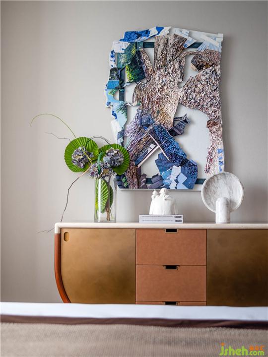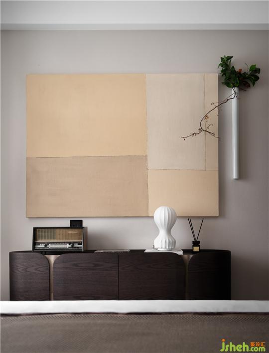 花藝通過鑲嵌的方式創(chuàng)新地承載于墻體,現(xiàn)代工藝與日式傳統(tǒng)沖撞,別富生趣。抽象畫以大塊面的顏色拼貼,以柔和色彩吐露溫馨、浪漫氣息
