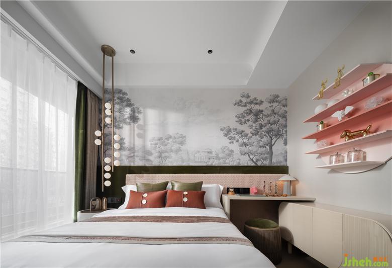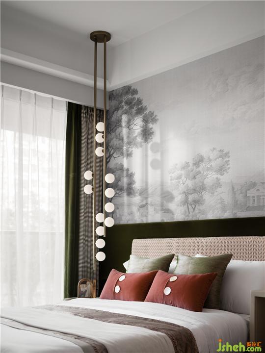 女兒房呈現(xiàn)更為豐富的色彩層次。設計師為空間加入朱紅、墨綠,豐富的色澤與金屬材質折合出優(yōu)雅與時尚的感受。疊墅樣板間設計背景墻擁有更為具體的畫面,遠遠近近的植被被白雪覆蓋,淺墨的筆觸得使人陷入安寧。