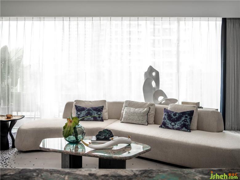 對優(yōu)雅生活的追逐無關真實風景,是主人一份始終心納山海的心情。為了增設更多的生活趣味與情調,設計師巧妙向自然界汲取靈感。海岸柔軟白沙的小丘,折合為沙發(fā)的形態(tài),充裕勾勒出對藝術、對生活的熱衷與享受。