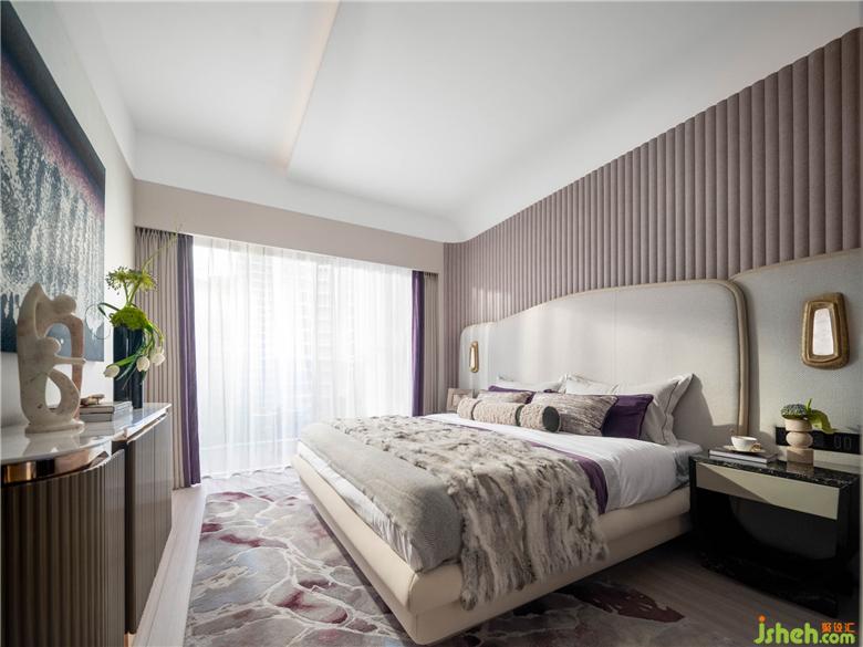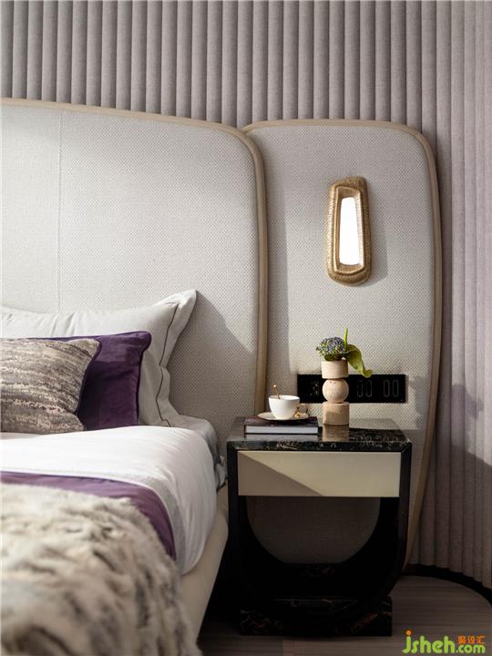 二層主臥空間以豐富的軟織物構造出一個異彩紛呈的摩登空間。魔芋紫與飽滿的米色相互交織,墻面處理因為豐富的材質顆粒帶來細膩、浪漫的居家生活感,原木框定床體曲線框架,在陽光的溫度中彌漫自然清香。