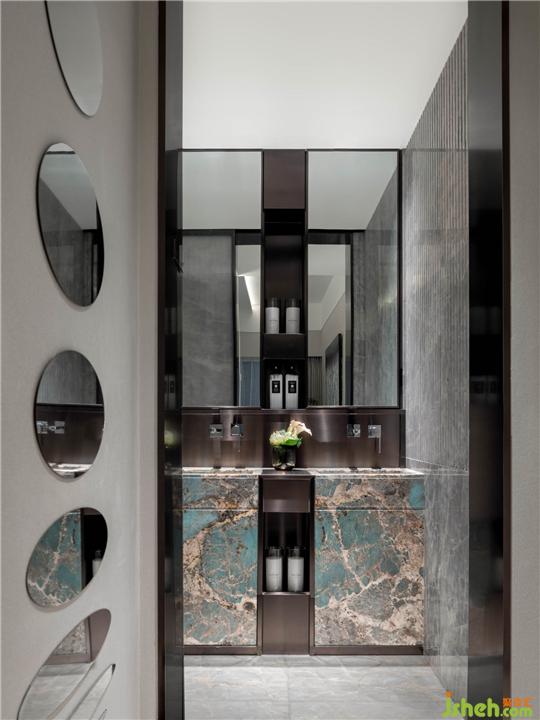 洗手間運用大量幾何形態(tài)處理。在此處,僅鏡面便擁有矩形、圓形多種形態(tài),以陳列分布,光影與鏡像增添空間對稱的趣味感。黑色為基底,石材質加入色彩的絢爛。