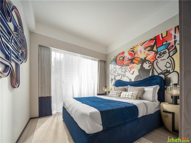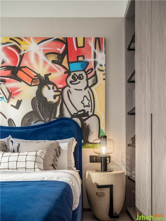 漫畫,一種簡單而夸張的藝術形式,詼諧幽默的手法極度顯露個性。男孩房大畫幅的漫畫幾乎覆蓋一整個墻面,疊墅樣板間設計使其看似像是個由漫畫手涂手畫出的空間,隨性而外放。床體與軟織物以幽深的藍著色,有著神秘而生動的海岸色彩。