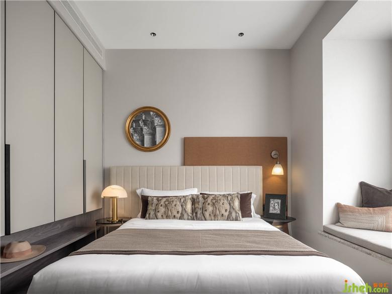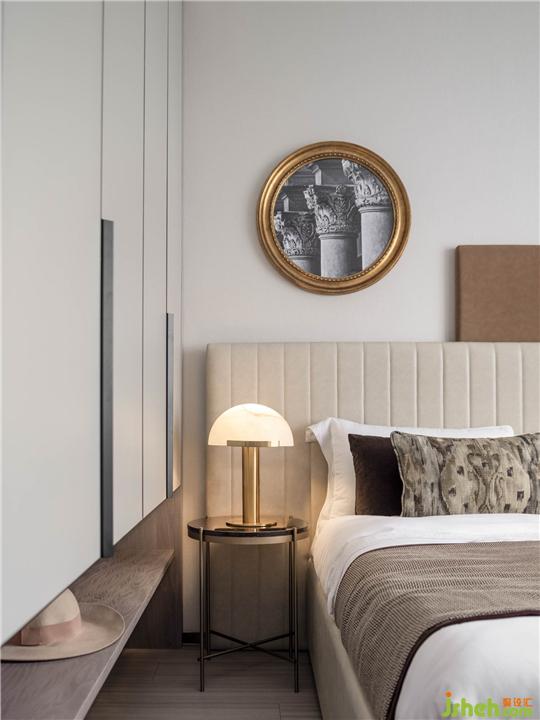 次臥空間注入復古的異國情調。墻面藝術畫由經典建筑細節(jié)構成,剎那間帶人流連于異國風景,文藝且浪漫,意在強調主人的生活經歷與日常習慣。經過梳理的墻體收納整齊有序,米色與咖色的經典配色使軟織物充滿溫馨的包容感。
