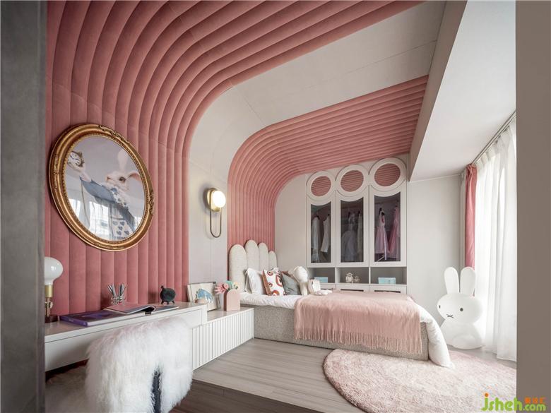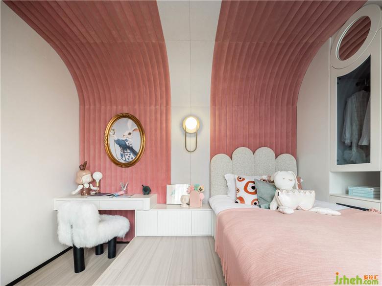 夢幻成為女孩房的主題,設計師將豐富的想象力內化于結構、形體、功能多個層面,疊墅樣板間設計使日常使用情境流露童話般的色彩。波紋形的軟織物以弧線的形式覆蓋整面墻,粉紅色展示空間的浪漫與純真。