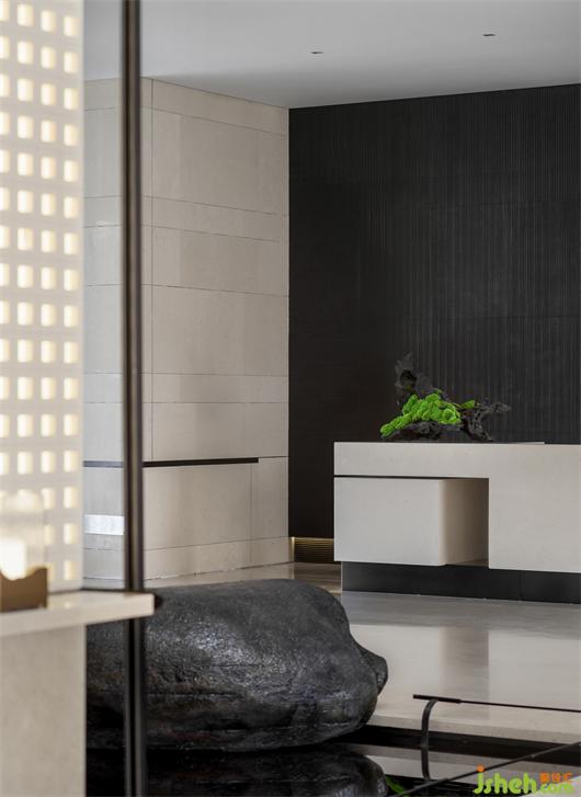 水景區(qū)增加了空間與自然的連結(jié)感,跳躍空間黑白色彩。藝術(shù)裝置如大海的黑色礁石匍匐于海灘。風(fēng)光陳列,浮于水面,將自然的風(fēng)味永恒呈現(xiàn)。