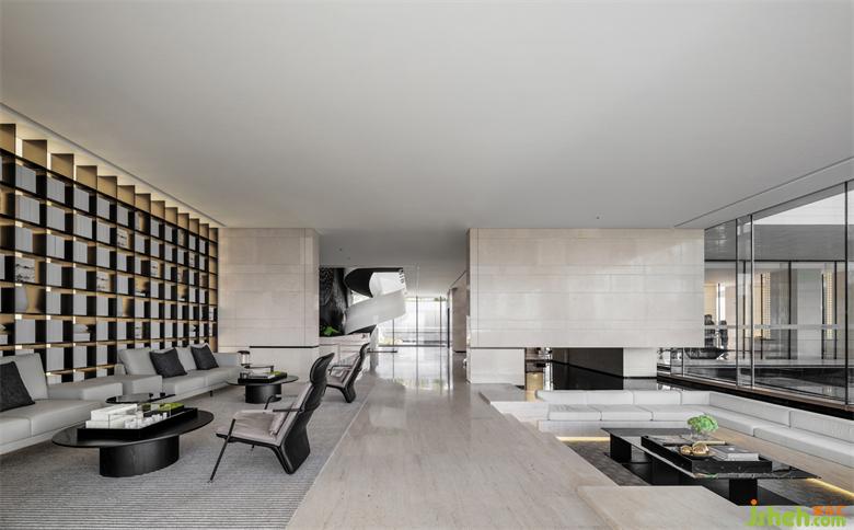 光,亦是空間的詩學(xué),使白擁有栩栩如生的可能。來自玻璃幕墻的大面積自然光增添了神圣感,局部性表現(xiàn)又充滿幾何趣味。經(jīng)過設(shè)計師處理,不同方向的光彼此交織,如織錦一般賦予黑白色空間新的“表皮”。