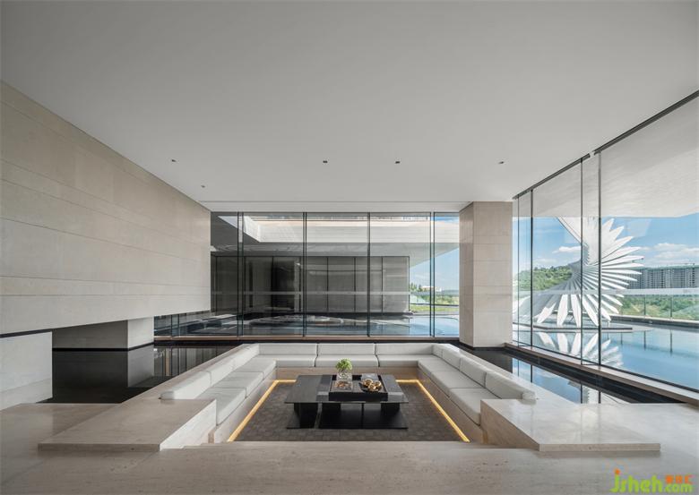 一半為可觸可感的墻體,一半是無敵視野風光。下沉式休息區(qū)擁有鮮明的幾何層次,銜接水景,與戶外風光親密相融。超寬的視野享受中,是酒店級的舒適與奢尚體驗。