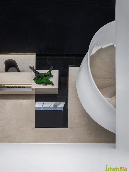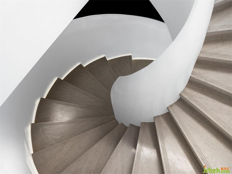 旋轉(zhuǎn)樓梯擁有卷曲的體型,如含苞似放的花朵,又像是一只卷曲的蝸牛??臻g的純白之詩因形體而擁有浪漫質(zhì)感,光的布局似月光一般晶瑩剔透。