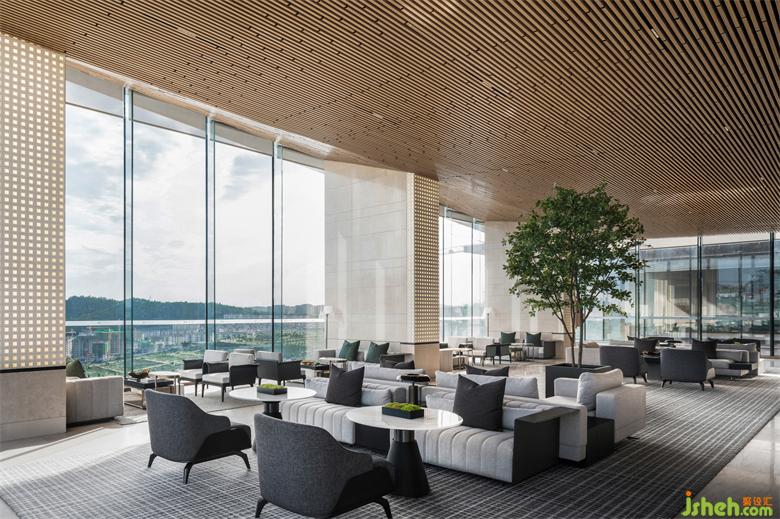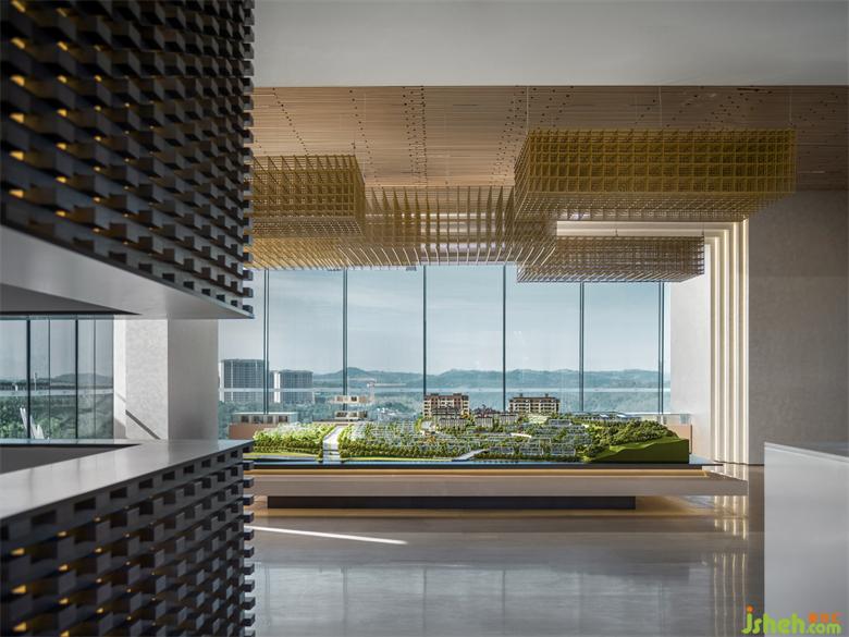 大面積的玻璃幕墻使建筑宛若一個盒子,方便設計師充分在自然中汲取靈感。以原木材質(zhì)為基底,讓空間注入溫潤的自然,調(diào)節(jié)局部溫度。天花空間原木材質(zhì)處理為細密的線條,創(chuàng)造更豐富的視覺層次。