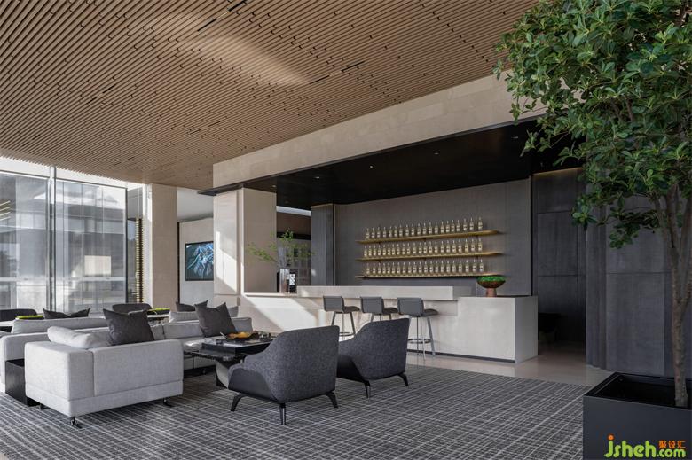 水吧臺是一種擁有特定功能屬性的空間,強調(diào)松弛感與休閑的社交氛圍。設計師通過酒瓶形成強烈的視覺符號,在無需更多墜飾的情況下,流露輕奢、灑脫之味。