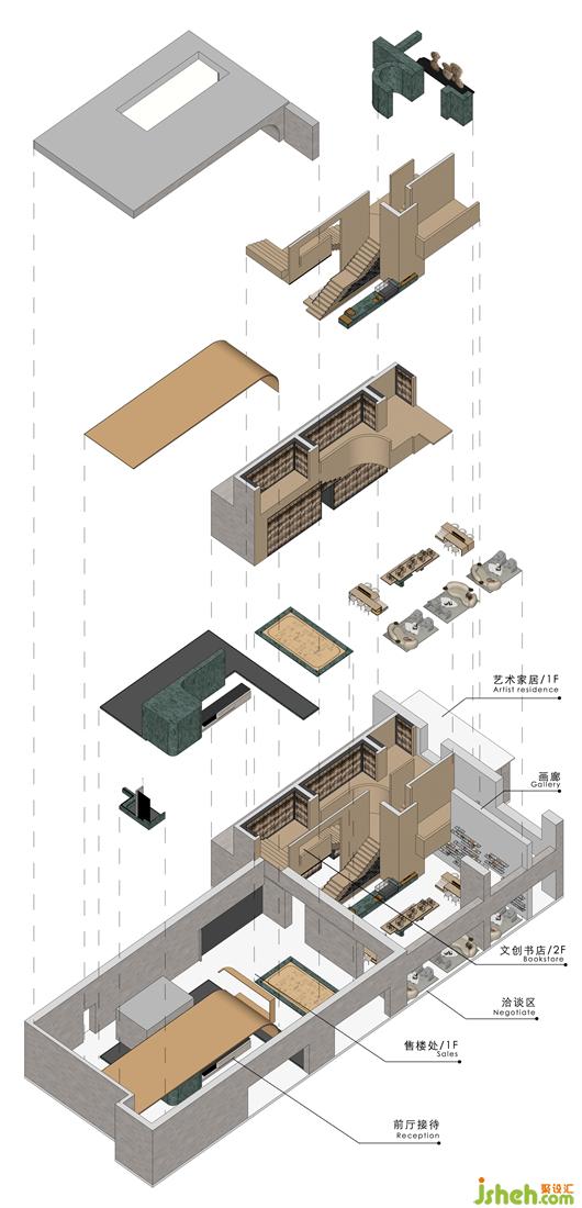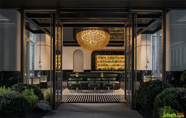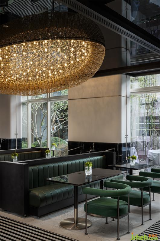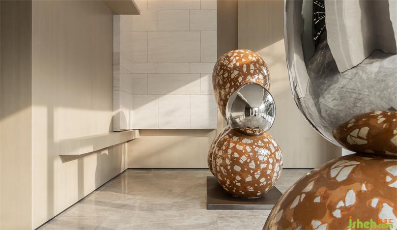 海派的精致腔調(diào)與東方意境糅合,復(fù)古色彩中充盈著素凈、風(fēng)雅,清淡繪出輕盈肌理。營(yíng)銷中心設(shè)計(jì)天花倒映著“松月”下的人文風(fēng)景,與海派特質(zhì)的條紋花磚映襯于空間中,頂面與地面彼此呼應(yīng),變化的紋理與色彩交織,如一支輕松的探戈變幻自如。